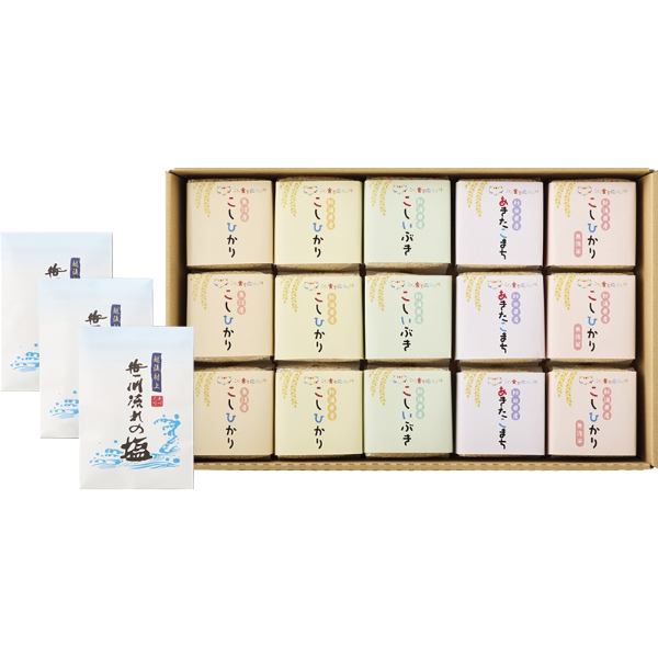 魚沼産コシヒカリ・新潟県産コシヒカリ・新潟県産こしいぶき・新潟県産コシヒカリ(無洗米)・秋田県産あきたこまち(各300g)・笹川流れの塩(80g)×各3
